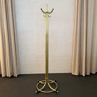 This Art Deco tubular anodized aluminum standing coatrack was designed by American designer Warren McArthur. The rack consists of four aluminum tubes banded together that elegantly flare at the base with a supportive ring and black rubber grips on each leg. At the top the tubes branch out into 8 hooks, four of them tipped with black rubber. There are exceptional disc and banding details throughout that connect these elements in keeping with McArthur's streamline profile of the art deco machine-age era.