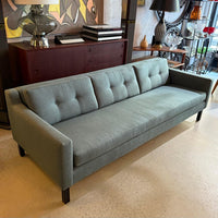 This classic mid-century modern sofa was designed by Edward Wormley for Dunbar Furniture circa the 1950s. It features a long low profile with fully upholstered frame and cushions in cool-toned medium blue woven linen blend. The cushions are updated to a single streamlined seat cushion with three buttoned back cushions atop the contrasting black laquered sculpted legs. This sleek sofa not only looks great but is quite comfortable for lounging.