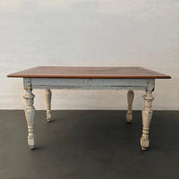 This charming antique farmhouse table with country house appeal is versatile with uses ranging from kitchen and dining seating 4-6 guests, work table, desk or side table. The table height is low at 27.25" with the apron ht at 22". Casters can be added to lift the table a few inches if needed.